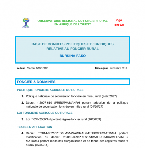 Base de donneés politiques et juridiques relative au foncier rural Burkina Faso