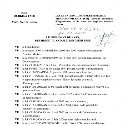 Category Politique et Juridique Burkina faso Décret n° 2010-399/PRES/PM/MAHRH/MRA/MECV/MEF/MATD/MJ portant modalités d'organisation et de tenue des registres fonciers ruraux Burkina Faso Se connecter ou s'inscrire pour publier un commentaire Télécharger 20. decret 2010-399 Registres fonciers ruraux_No399.pdf358.66 Ko