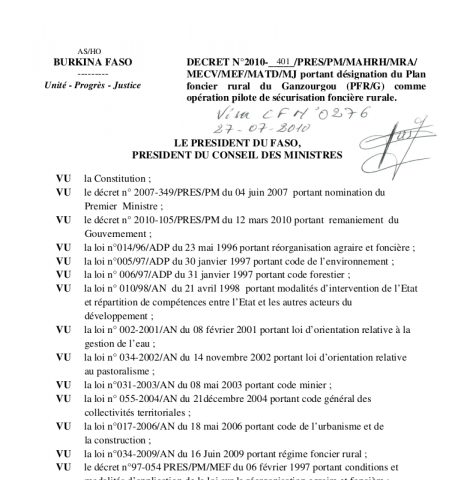 Décret n° 2010-401/PRES/PM/MAHRH/MRA/MECV/MEF/MATD/MJ portant désignation du Plan foncier rural du Ganzourgou (PFR/G) comme opération pilote de sécurisation foncière rurale Burkina Faso