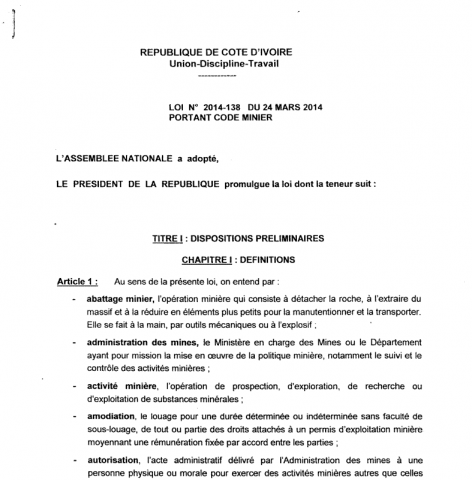 Category Politique et Juridique Côte d'Ivoire Loi n° 2014-138 du 24 mars 2014 portant code minier Côte d'Ivoire Se connecter ou s'inscrire pour publier un commentaire Télécharger 34. Loi n°2014-138 du 24 mars 2014 portant Code minier.pdf2.44 Mo