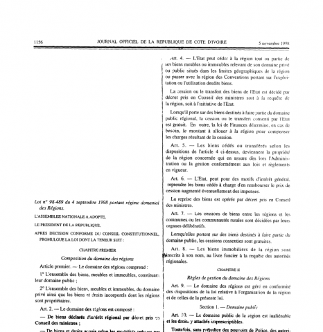 Category Politique et Juridique Côte d'Ivoire Loi n° 98-489 du 4 septembre 1998 portant régime domanial des Régions Côte d'Ivoire Se connecter ou s'inscrire pour publier un commentaire Télécharger 30. Loi nº 98-489 portant régime domanial des Régions.pdf153.65 Ko