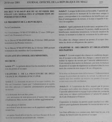 Category Politique et Juridique Mali Décret n° 01-041/P-RM du 02 février 2001 fixant les modalités d'attribution du permis d'occuper - Mali Se connecter ou s'inscrire pour publier un commentaire Télécharger 12. Décret N°01-041 fixant les modalités d’attribution du permis d'occuper_.pdf295.27 Ko