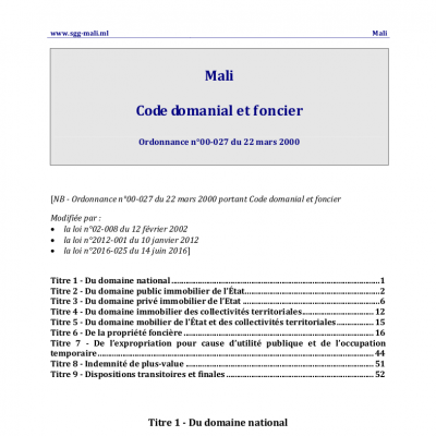 Ordonnance n° 00-027 P-RM du 22 mars 2000 portant code domanial et foncier - Mali