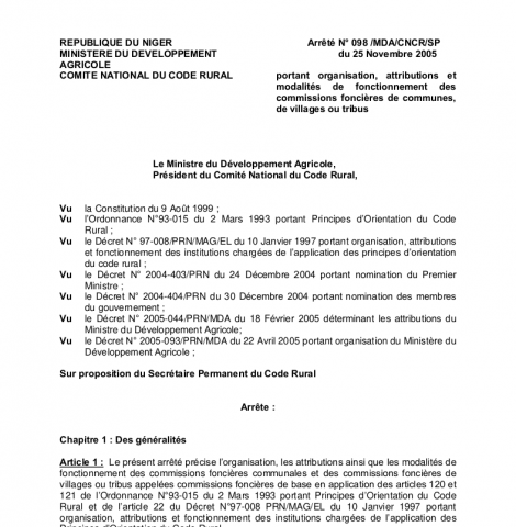 3. Arrêté n° 098/MDA/CNCR/SP du 25 novembre 2005 portant organisation, attributions et modalités de fonctionnement des commissions foncières de communes, de villages ou tribus Niger