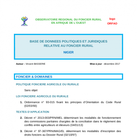 Base de donneés politiques et juridiques relative au foncier rural Niger