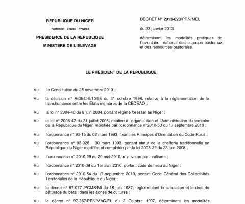 Décret n° 2013-028/PRN/MEL du 23 janvier 2013 déterminant les modalités pratiques de l'inventaire national des espaces pastoraux et des ressources pastorales Niger