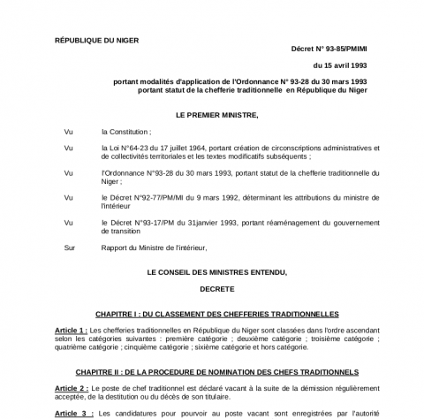 3. Décret n° 93-85/PMIMI du 15 avril 1993 portant modalités d'application de l'Ordonnance N° 93-28 du 30 mars 1993 portant statut de la chefferie traditionnelle en République du Niger
