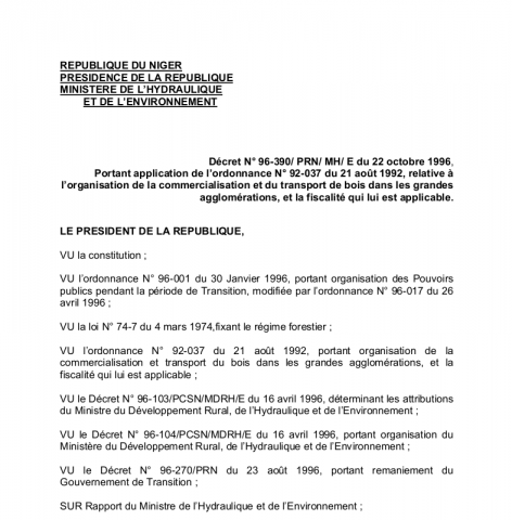 Décret n° 96-390/PRN/MH/E du 22 octobre 1996, portant application de l’ordonnance N° 92-037 du 21 août 1992, relative à l’organisation de la commercialisation et du transport de bois dans les grandes agglomérations, et la fiscalité qui lui est applicable