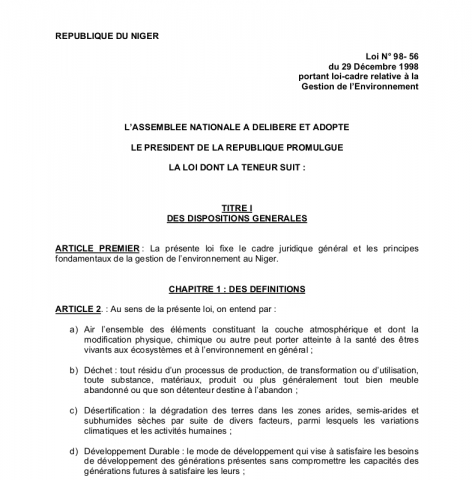 Category Politique et Juridique Niger Loi n° 98-56 du 29 décembre 1998 portant loi-cadre relative à la gestion de l'environnement Se connecter ou s'inscrire pour publier un commentaire Télécharger 17. Loi_N°98-056_Gestion_Environnement.pdf114.75 Ko