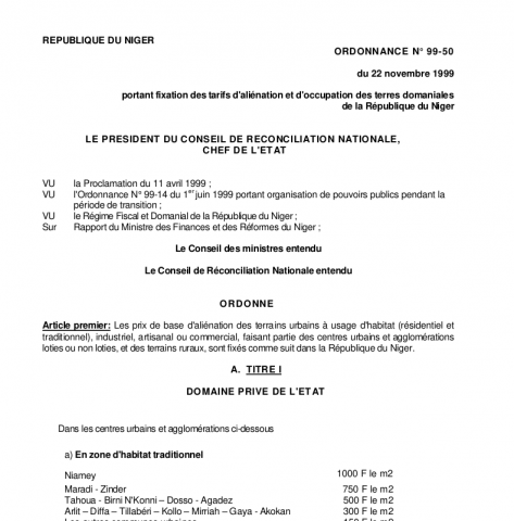 Category Politique et Juridique Niger Ordonnance N° 99-50 du 22 novembre 1999 portant fixation des tarifs d'aliénation et d'occupation des terres domaniales de la République du Niger Se connecter ou s'inscrire pour publier un commentaire Télécharger 07. Ordonnance N° 99-50 tarifs d'aliénation et d'occupation des terres domaniales.pdf19.75 Ko