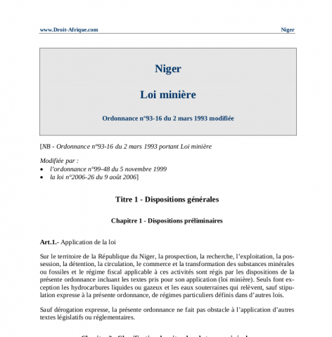 Ordonnance n°93-16 du 2 mars 1993 modifiée Loi minière Niger