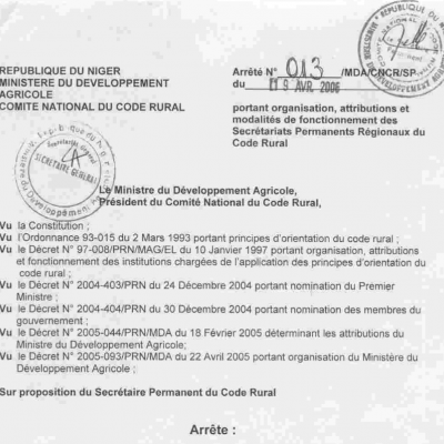 Arrêté n° 013/MDA/CNCR/SP du 19 avril 2006 portant organisation, attributions et modalités de fonctionnement des Secrétariats Permanents Régionaux du Code Rural Niger