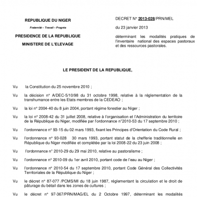 Décret n° 2013-028/PRN/MEL du 23 janvier 2013 déterminant les modalités pratiques de l'inventaire national des espaces pastoraux et des ressources pastorales Niger