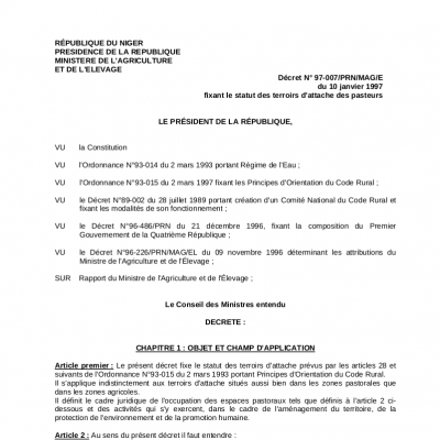 Décret n° 97-007/PRN/MAG/E du 10 janvier 1997 fixant le statut des terroirs d'attache des pasteurs Niger